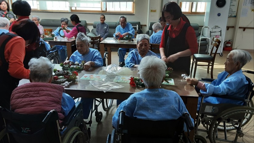 올려두며 어르신들의 손끝에서 아름다운 크리스마스 리스가 차곡차곡 완성되었다.